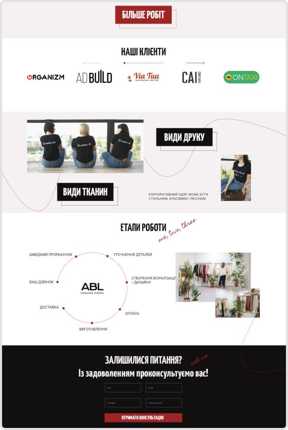 ABL — український виробник корпоративного та промо-одягу. Компанія спеціалізується на повному циклі: від розробки дизайну та лекал до пошиття, друку та серійного виробництва. Замовник звернувся до нас із потребою створити сучасний веб-ресурс, який би відобразив стиль бренду, якість продукції та професійний підхід компанії. Ми мали поєднати емоційний візуал, зручний інтерфейс і точне передання цінностей ABL.