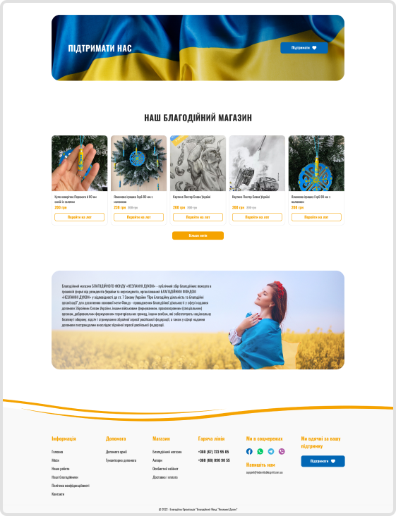 Для фонду «Незламні духом» ми створили повноцінний веб-ресурс, який поєднує інформаційний сайт, прозорі інструменти збору пожертв та благодійний інтернет-магазин. Основний акцент зроблено на зручній структурі, швидкому донаті та візуальній подачі проєктів і робіт митців, з продажу яких формуються внески на підтримку України.